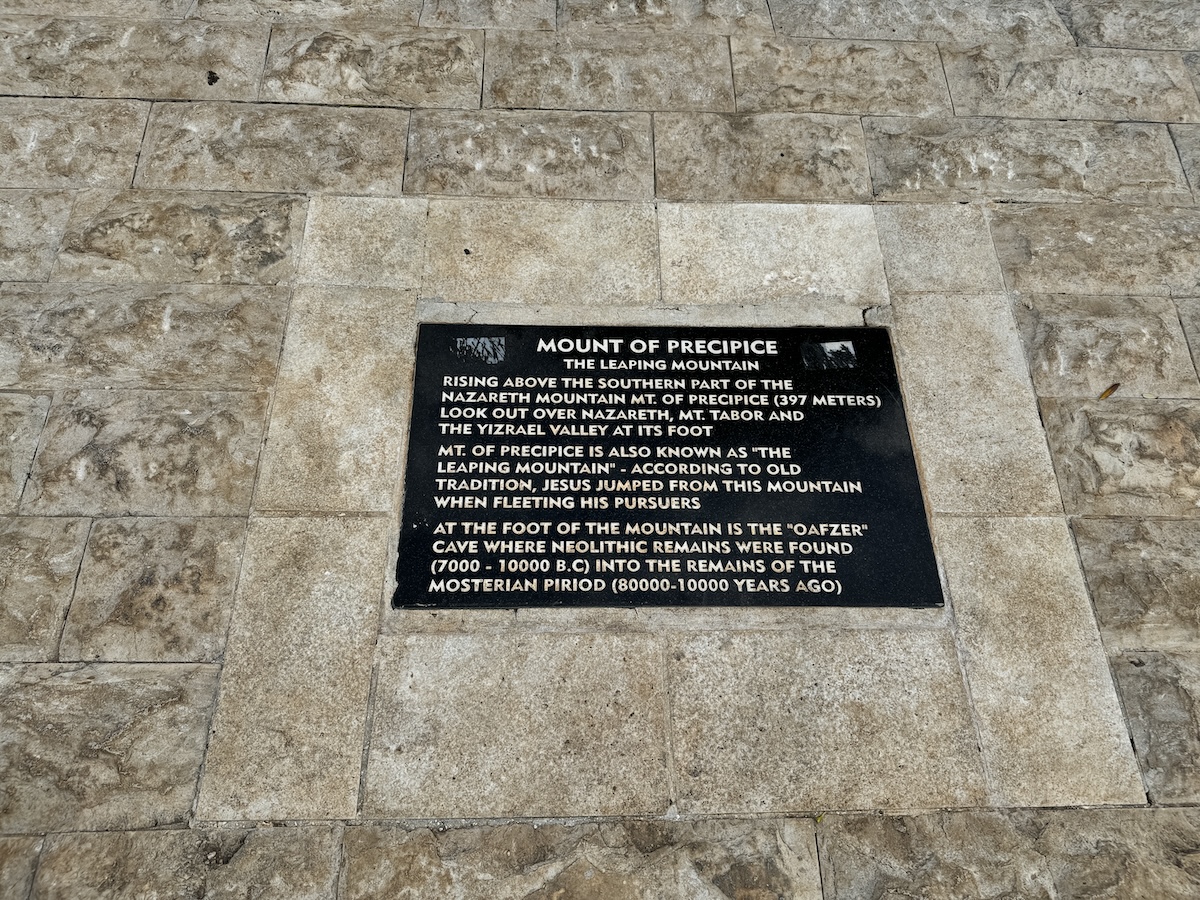 Only, according to the Bible account, "They rose up and rushed him outside the city, and they led him to the brow of the mountain on which their city had been built, in order to throw him down headlong." So not the mountain opposite Nazareth, but the mountain on which the city itself was built. But there is also another funny detail, a plaque on this mountain states that according to an old tradition, Jesus jumped off this mountain to escape his pursuers.