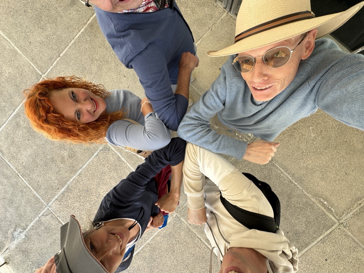 (1) Morning view of Jerusalem from our hotel room on the Mount of Olives, (2) These original stones were on the top of what must have been King David's palace, well over 1000 B.C. (3) These were ornaments of King Hezekiah's palace, (4) Oldest stone inscribed "Beit David" (House of David) in Paleo-Hebrew script from the 9th century B.C., (5) Early 6th century B.C. on a tomb wall with inscription (almost illegible, more obsolete with modern techniques) "YHVH is the God of the whole earth, (6) Here even I can read the name Jehovah, on a stone from the 9th century B.C. so now about 3000 years old, (7) Who is that man next to Karin? And what a big head he has.... (8) Original stone found in Ceasarea with inscription Pontius Pilate, (9) Maquette of Jerusalem 2 years before its destruction in the year 70, (10) Group of friends, (11) The large stones are original from Jesus' time, this is the corner between West and South, (12) In a park nearby a kind of globe, and you can see Ecuador in the center of the picture here.