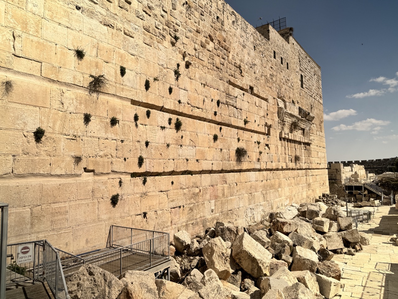 What you can already see here are the original large stones from the high walls surrounding the temple grounds that were thrown down -not by the Romans to destroy the temple and the city but- by the Jewish defenders on the Roman soldiers.