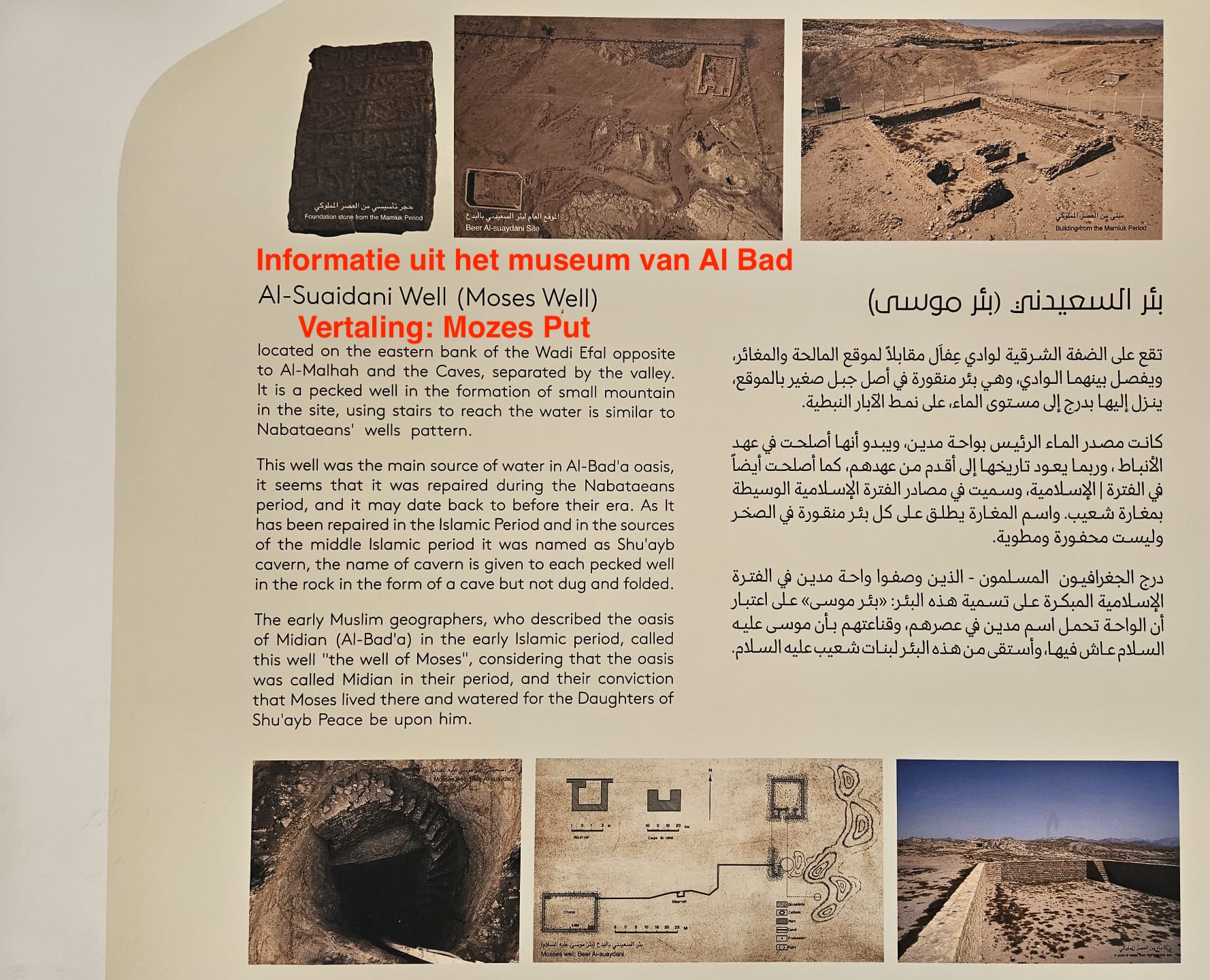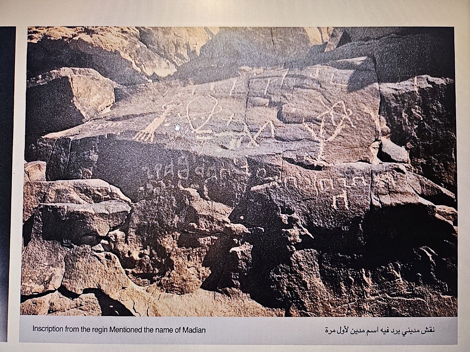 The museum also writes that what is now called nearby Al Bad'a used to be called Midian, or also Midian Kingdom, and shows a picture of an ancient inscription from this region that has the name Madian or Midian on it.