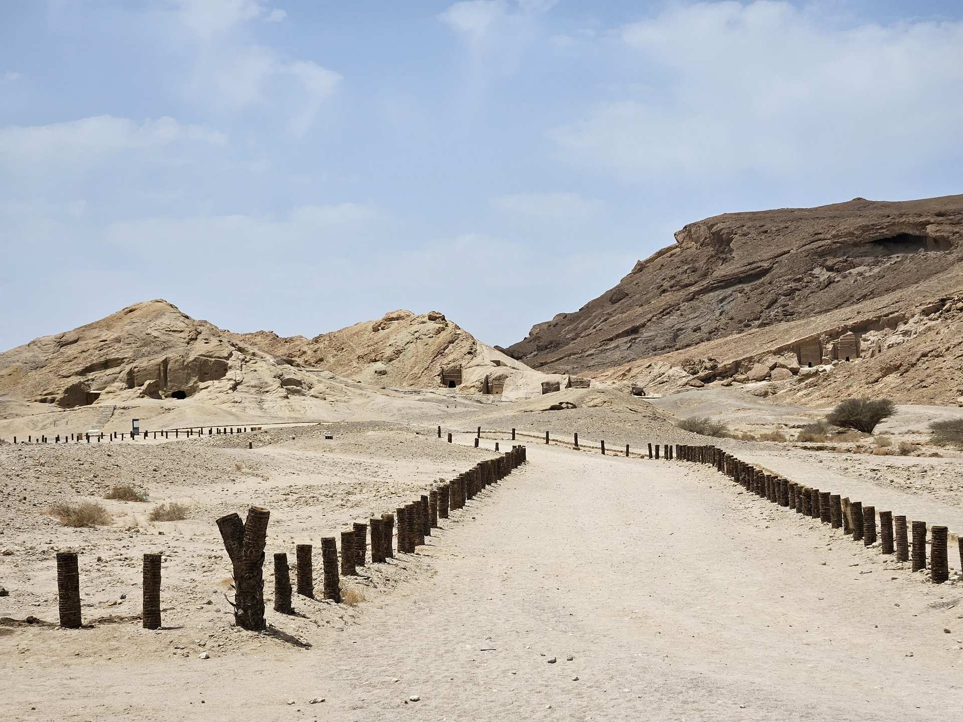 (1) Caves said to have once been inhabited by Rehuel or Jethro, Moses' father-in-law, and the well said to be the one where Jethro's daughters drew water. (2) Here the spot where the pillar stood and where the Israelites could have arrived after passing through the Red Sea. If you look closely, you can see at the end behind us the 'triangle' at the Egyptian side of this branch of the Red Sea where there is an opening in the mountains through which the Israelites could have passed with Pharaoh's army following.