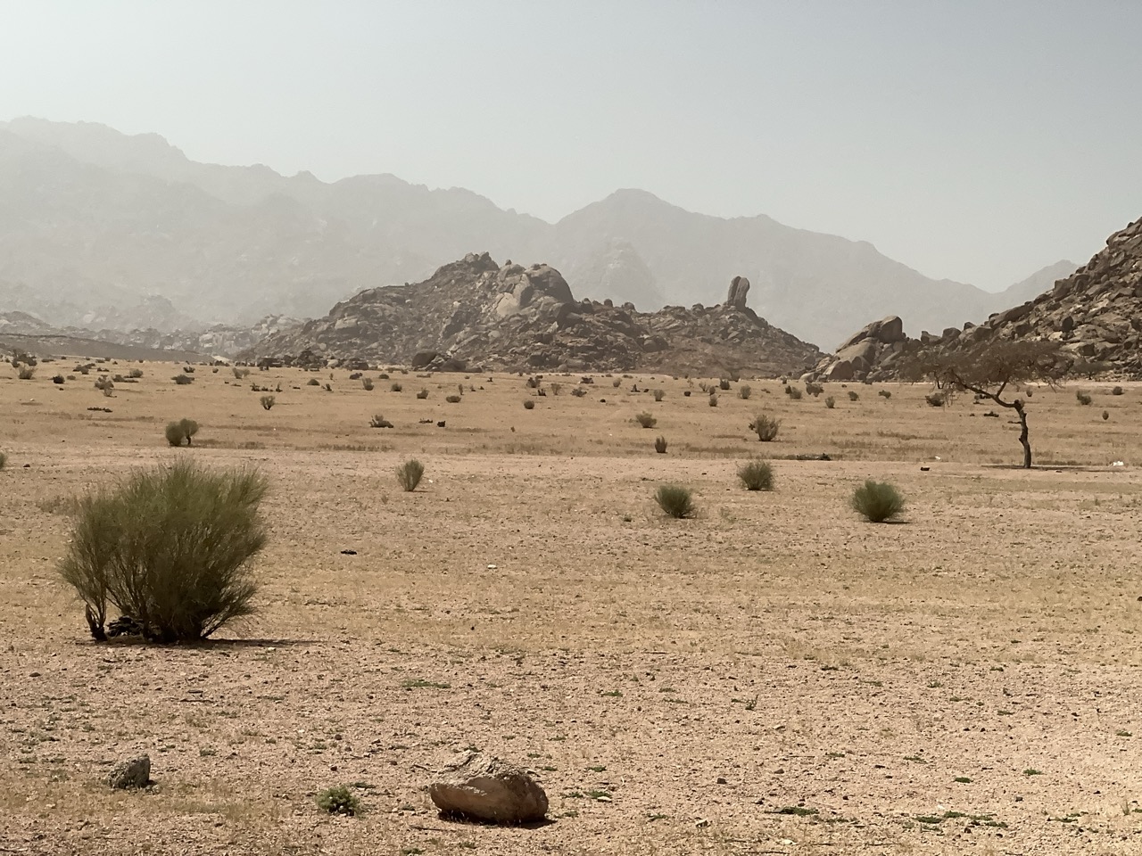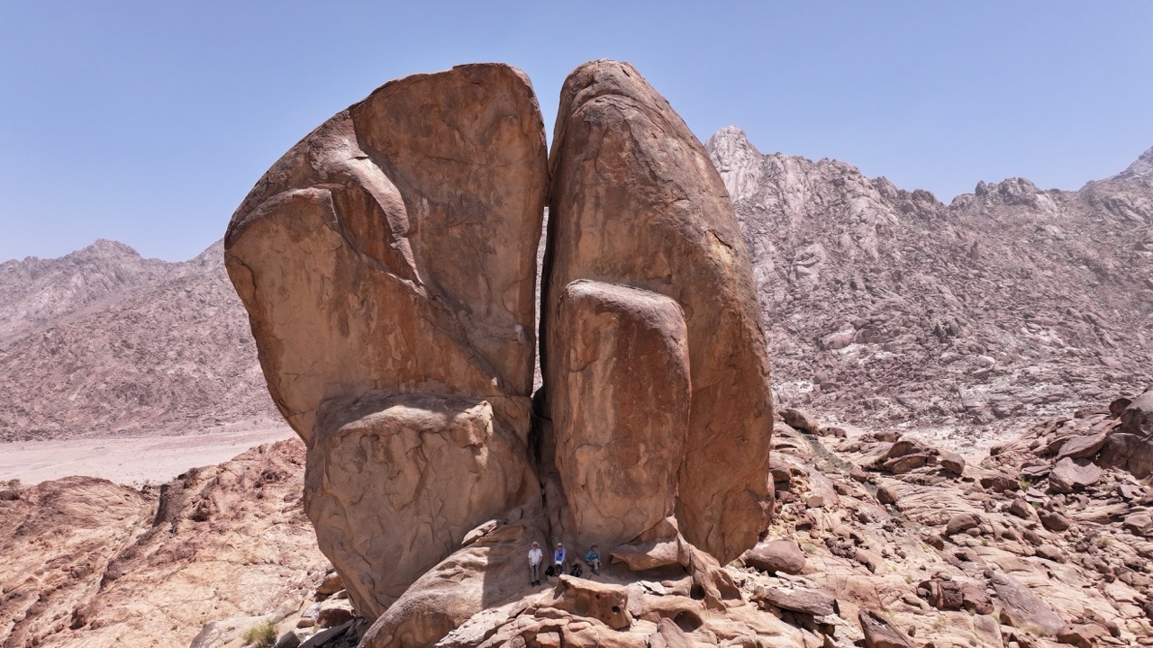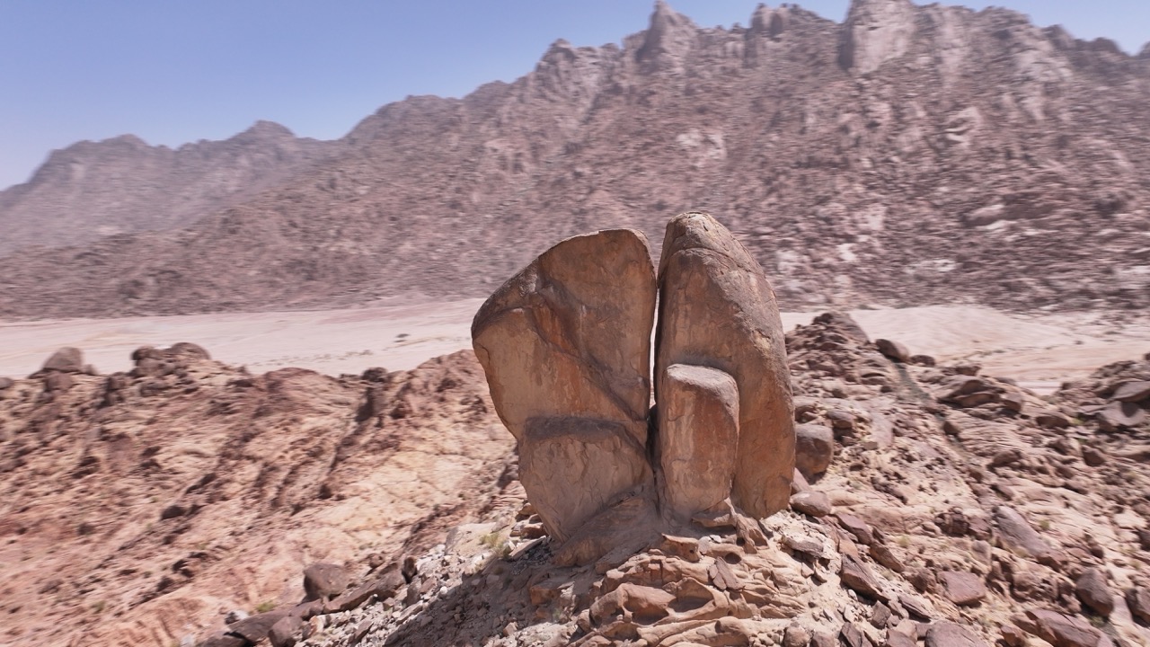 (1) Through the wilderness towards the split rock, (2) the split rock, (3) possible hill overlooking the terrain of the battle with the Amalekites, (4) camels and sheep and goats in the wilderness.