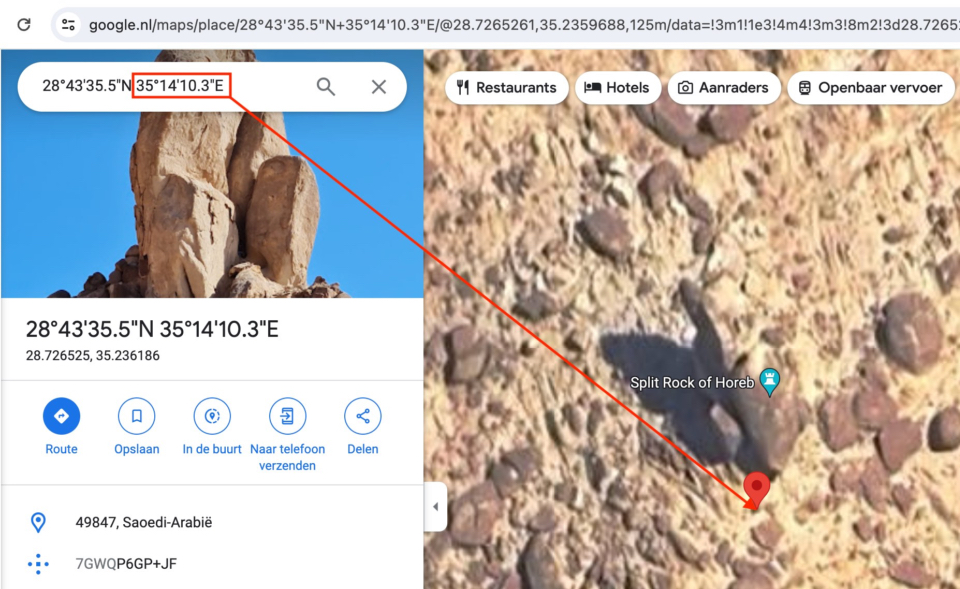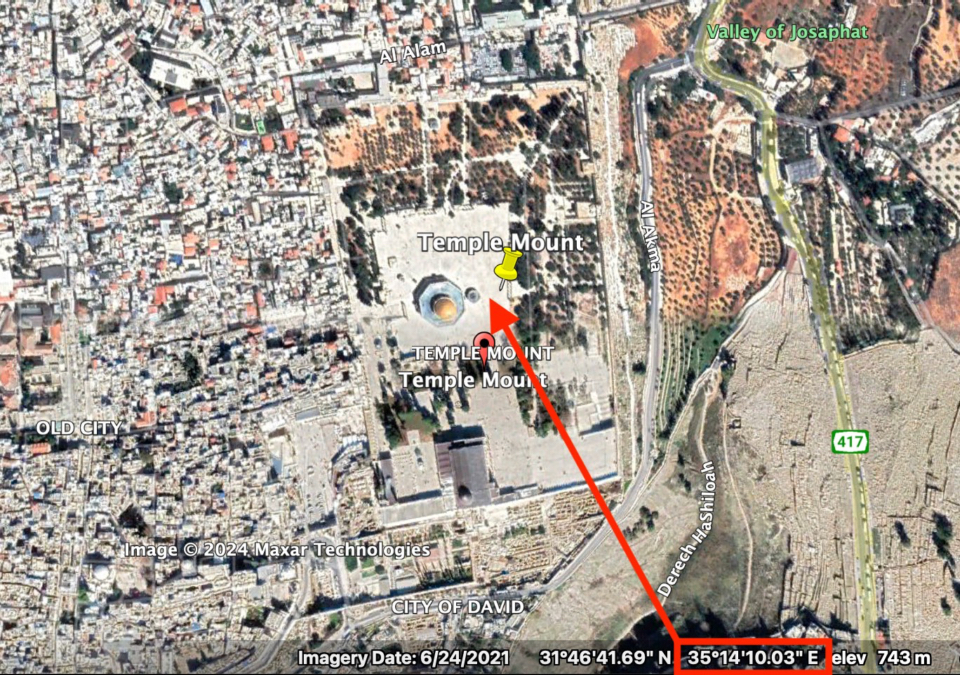A small but impressive coincidence? GPS Coordinates on the globe have a latitude, meaning a horizontal line from West to East, and a longitude, meaning a vertical line from North to South. According to my GPS, the longitude at the Split Rock was 35 degrees 14'10.03" East, and if I now go up in a straight vertical line I end up exactly at the temple grounds in Jerusalem, and even about exactly at the spot of the former sanctuary, i.e. where the curtain 'split' in two from top to bottom. Is this a coincidence, or does it have a deeper meaning? Can I make sense of this? No. But it is remarkable.